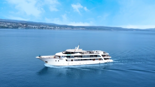 The ship features a large sun deck with a jacuzzi and plenty of loungers, providing the perfect setting to soak in the sun while enjoying breathtaking sea views. Guests are treated to exquisite dining in the elegant onboard restaurant, where fresh local ingredients create a feast for the senses.